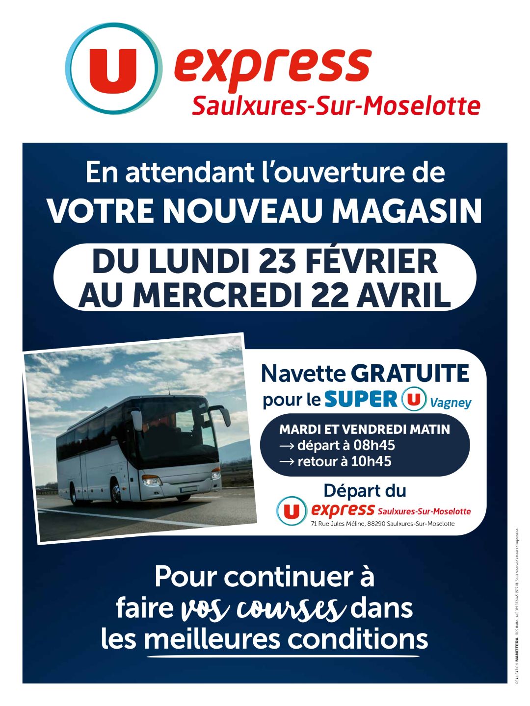 En attendant l'ouverture de votre nouveau magasin U Express, une navette gratuite vers le Super U Vagney est mise en place du lundi 23 février au mercredi 22 avril :